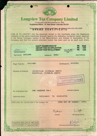 India 1994's Longview Tea Company Ltd. Share Certificate # FA12