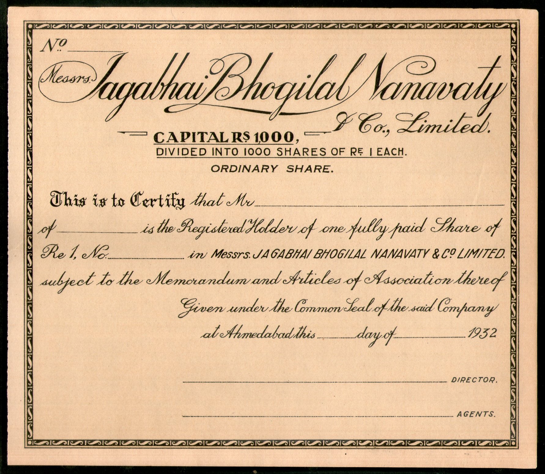 India 1932 Jagabhai Bhogilal Nanavaty & co. Share Certificate # FA08
