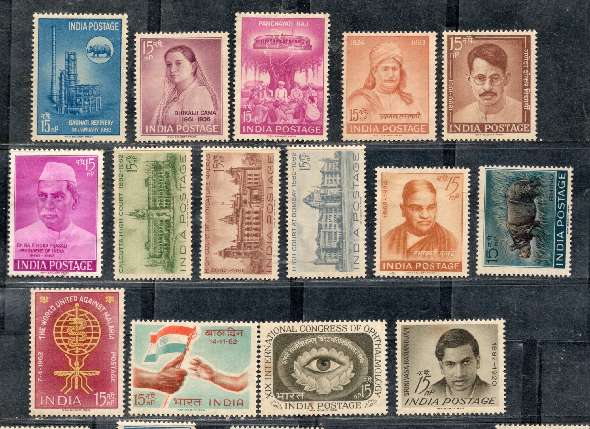 India 1962 Year Pack of 15 Stamps Oil Refinery High Court Wildlife Malaria Ophthalmology Children's Day Mounted Mint # 12572