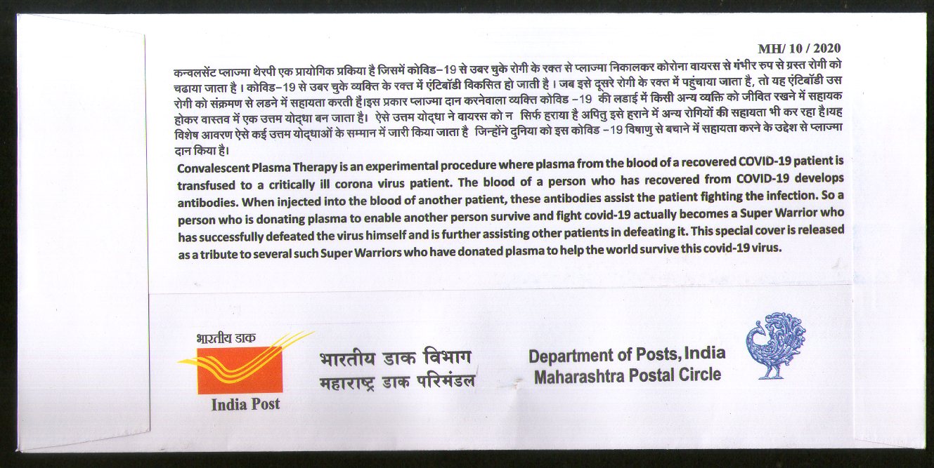 India 2020 Plasma Donors Super Warriors COVID-19 Health Special Cover # 18737