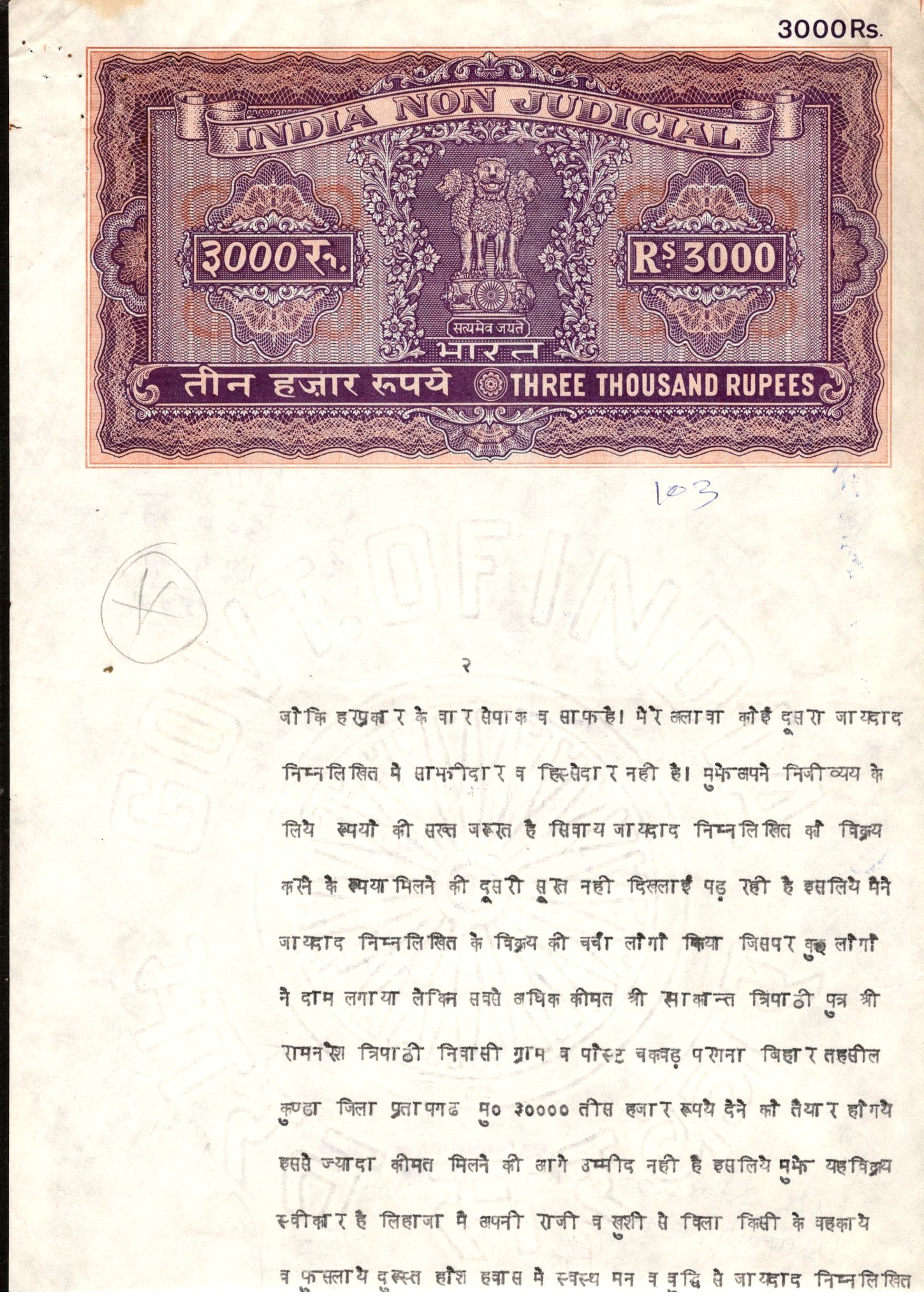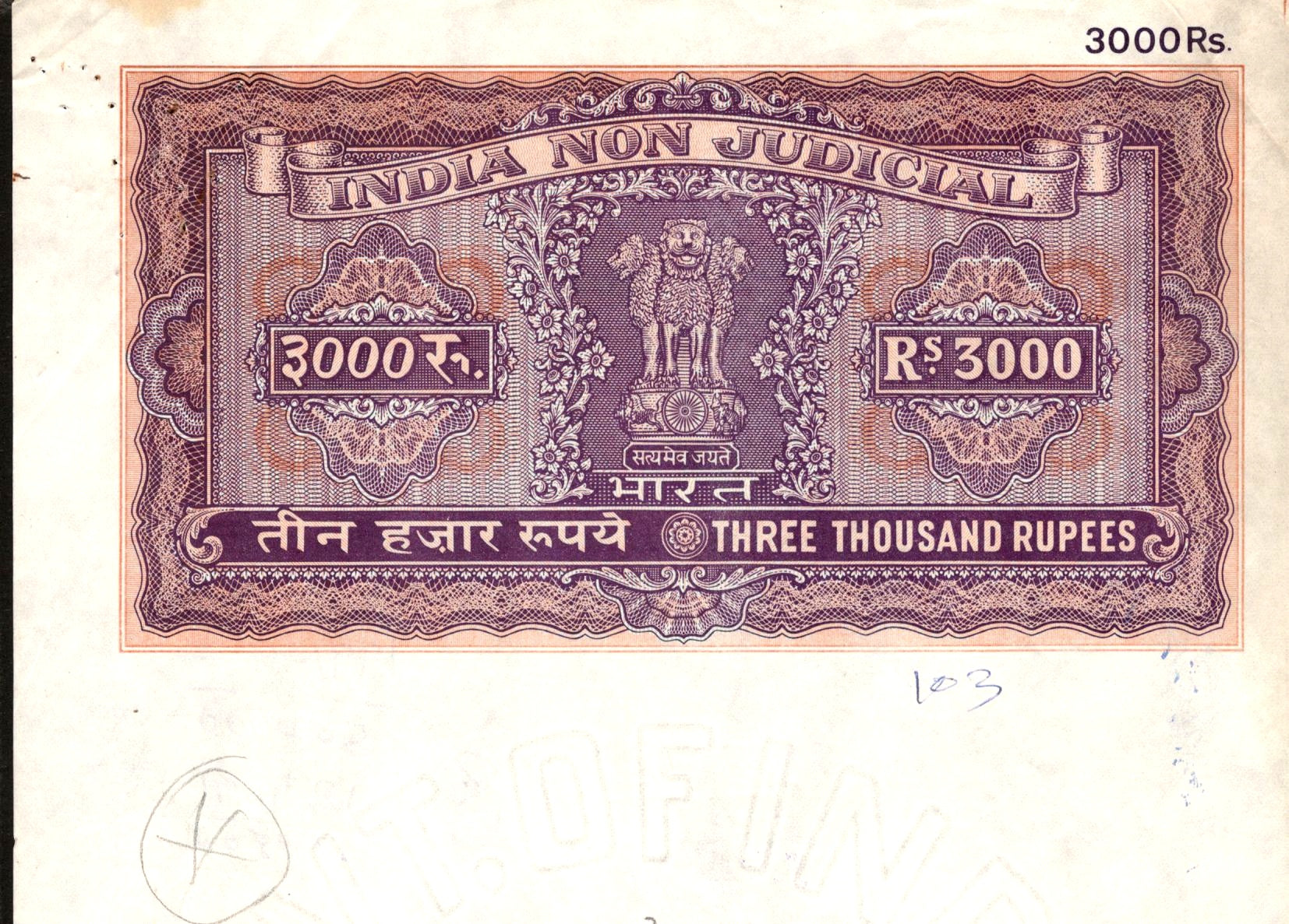 India Fiscal Rs.3000 Ashokan Stamp Paper Court Fee Revenue WMK-16 Good Used # 40B