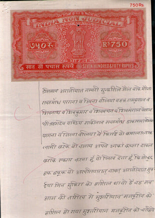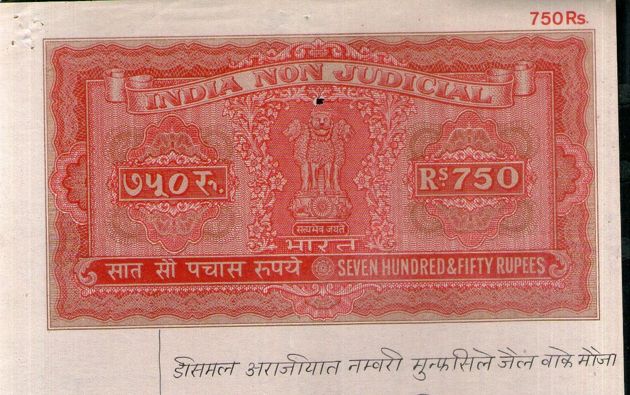 India Fiscal Rs.750 Ashokan Stamp Paper Court Fee Revenue WMK-17 Good Used # 62E