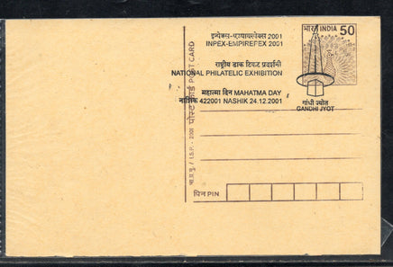 India 2001 50p Peacock INPEX Mahatma Day Gandhi Jyot Cancellation Post Card # 5717