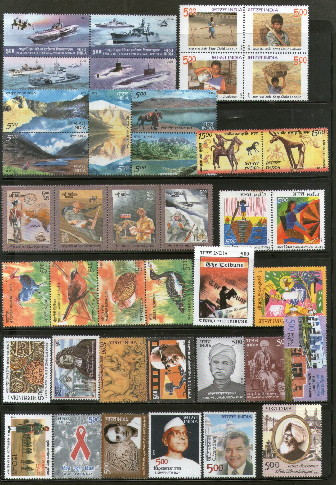India 2006 Year Pack 65 Stamps Birds Dance Himalayan Lakes Military Joints Issue Health Music MNH