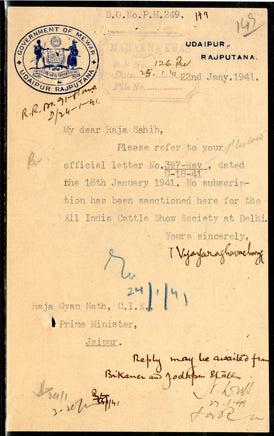 India Princely State - Mewar Udaipur Rajputana Crested Letter Head Coat of Arms to Jaipur # 9243