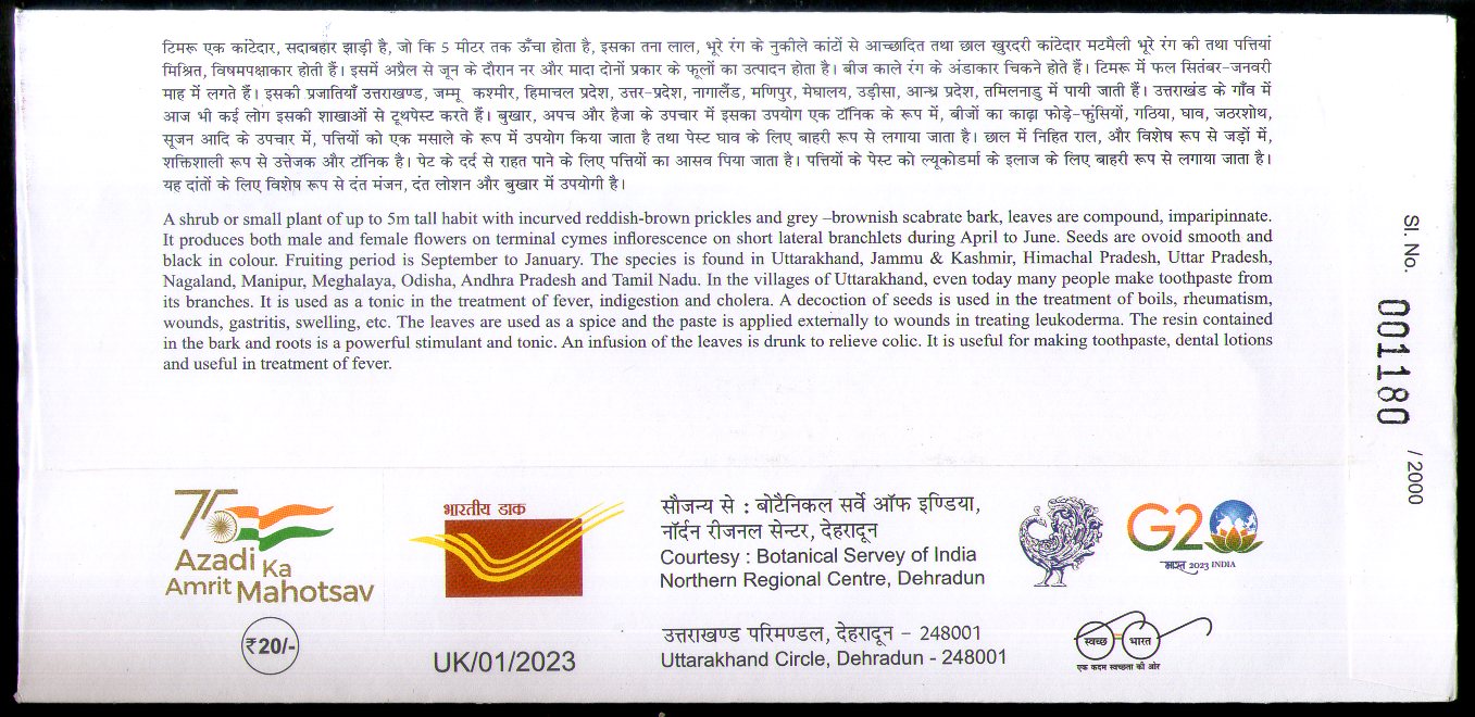 India 2023 Timroo Toothache Tree Plant Special Cover # 6814