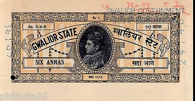 India Fiscal Gwalior State 6 As King Stamp Paper Type 90 KM 905 Used # 10816E