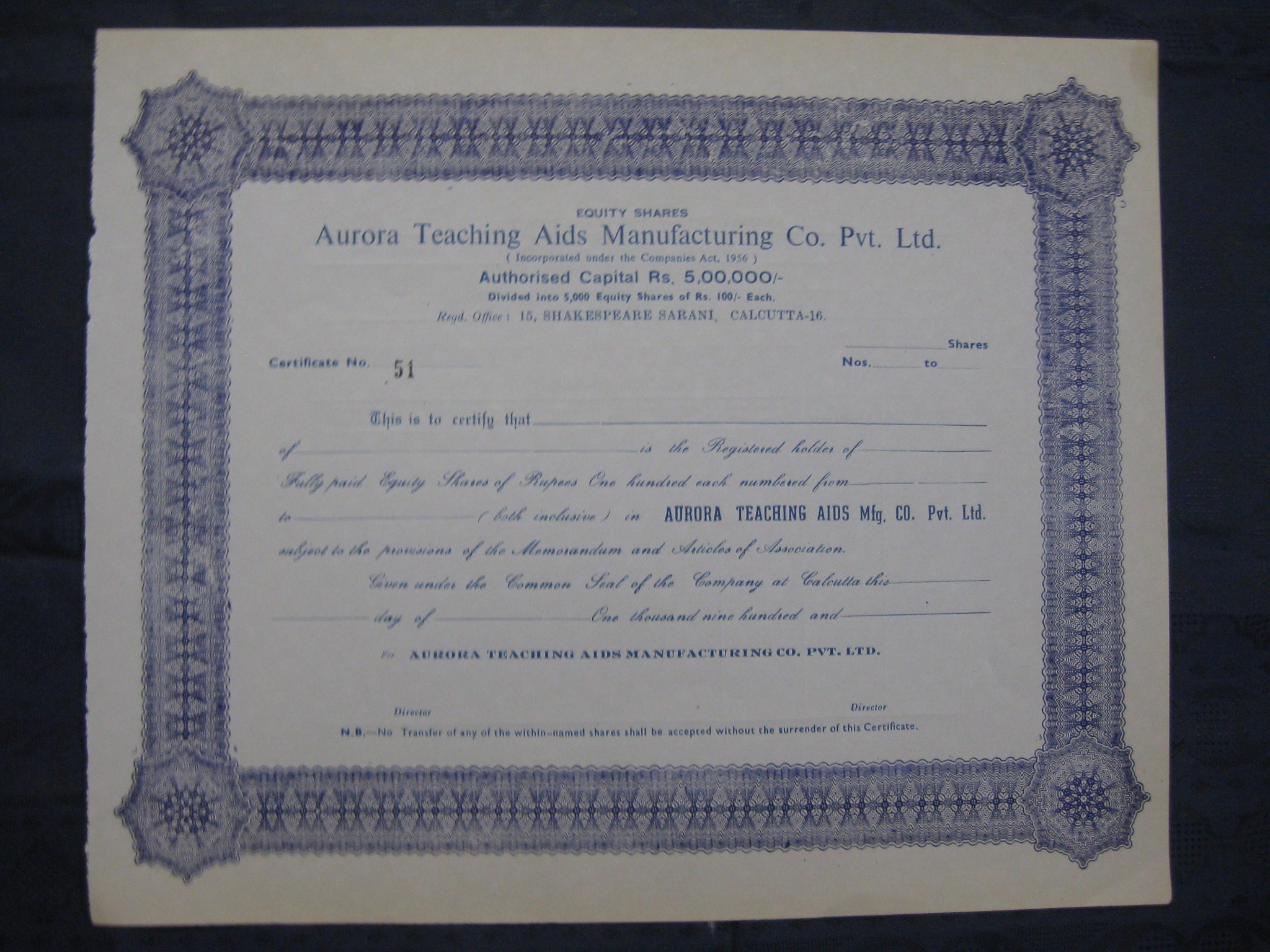 India Aurora Teaching Aids Manufacturing Co.Pvt Ltd. Share Certificate # FB3