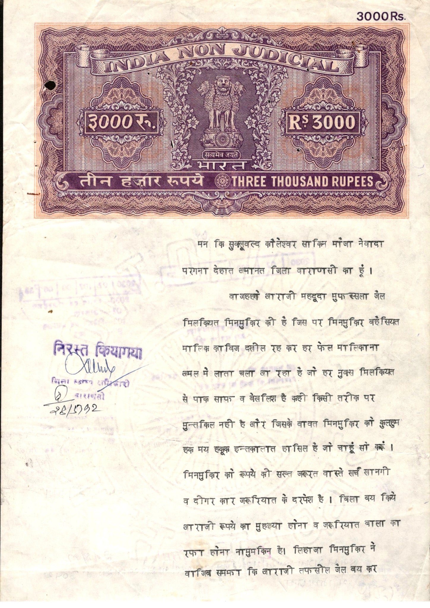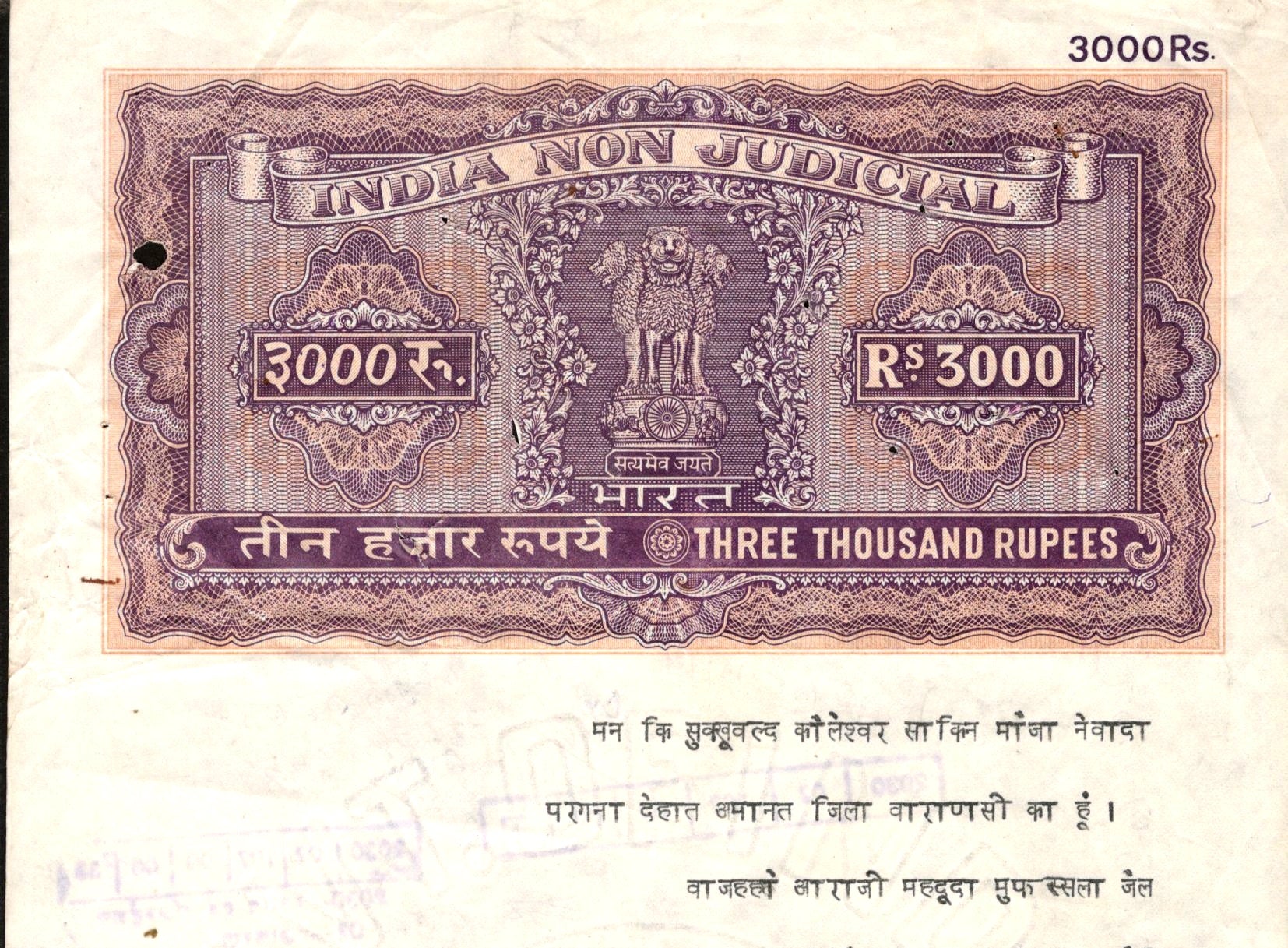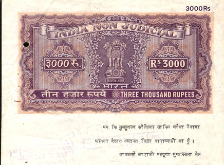 India Fiscal Rs.3000 Ashokan Stamp Paper Court Fee Revenue WMK-16 Good Used # 40A
