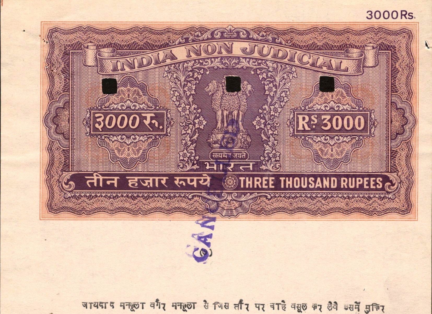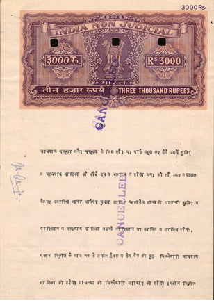 India Fiscal Rs.3000 Ashokan Stamp Paper Court Fee Revenue WMK17B Good Used # 38A