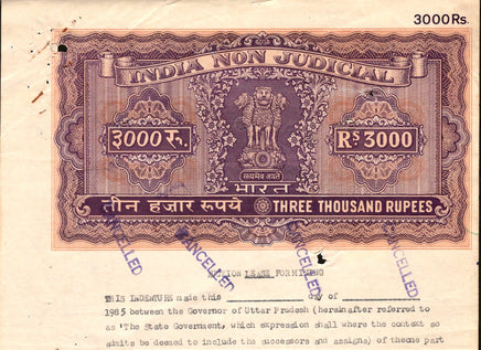 India Fiscal Rs.3000 Ashokan Stamp Paper Court Fee Revenue WMK17B Good Used # 38C