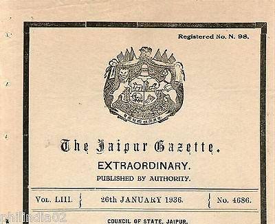 India JAIPUR State 1936 King George V Death Extraordinary State Gazette Rare