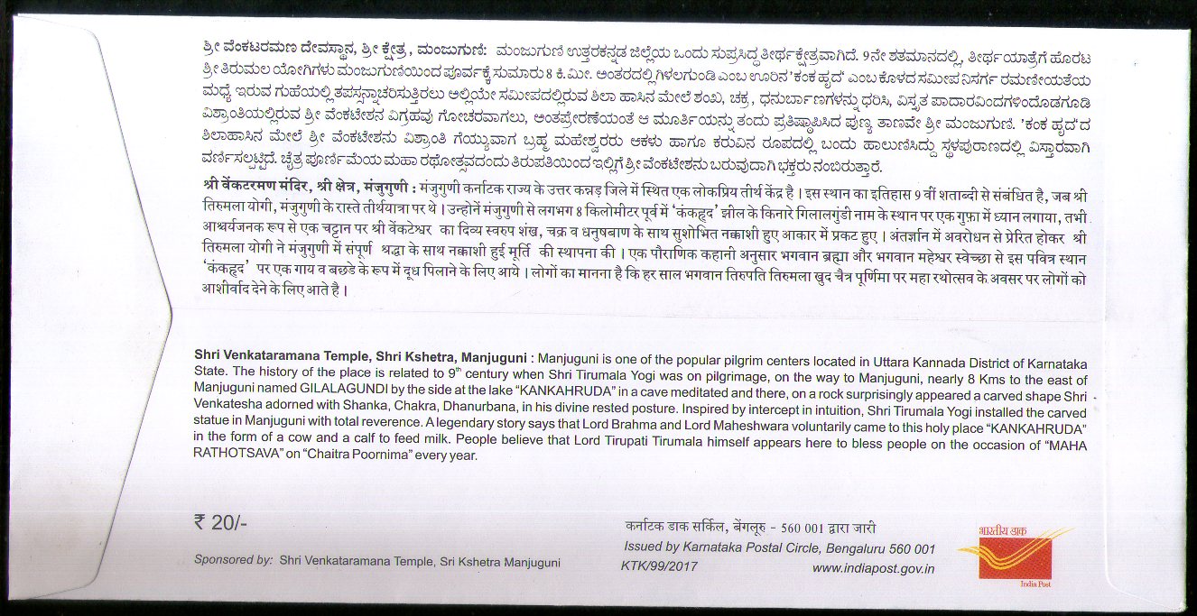India 2017 Shri Venkataramana Temple Hindu Mythology Special Cover # 18275