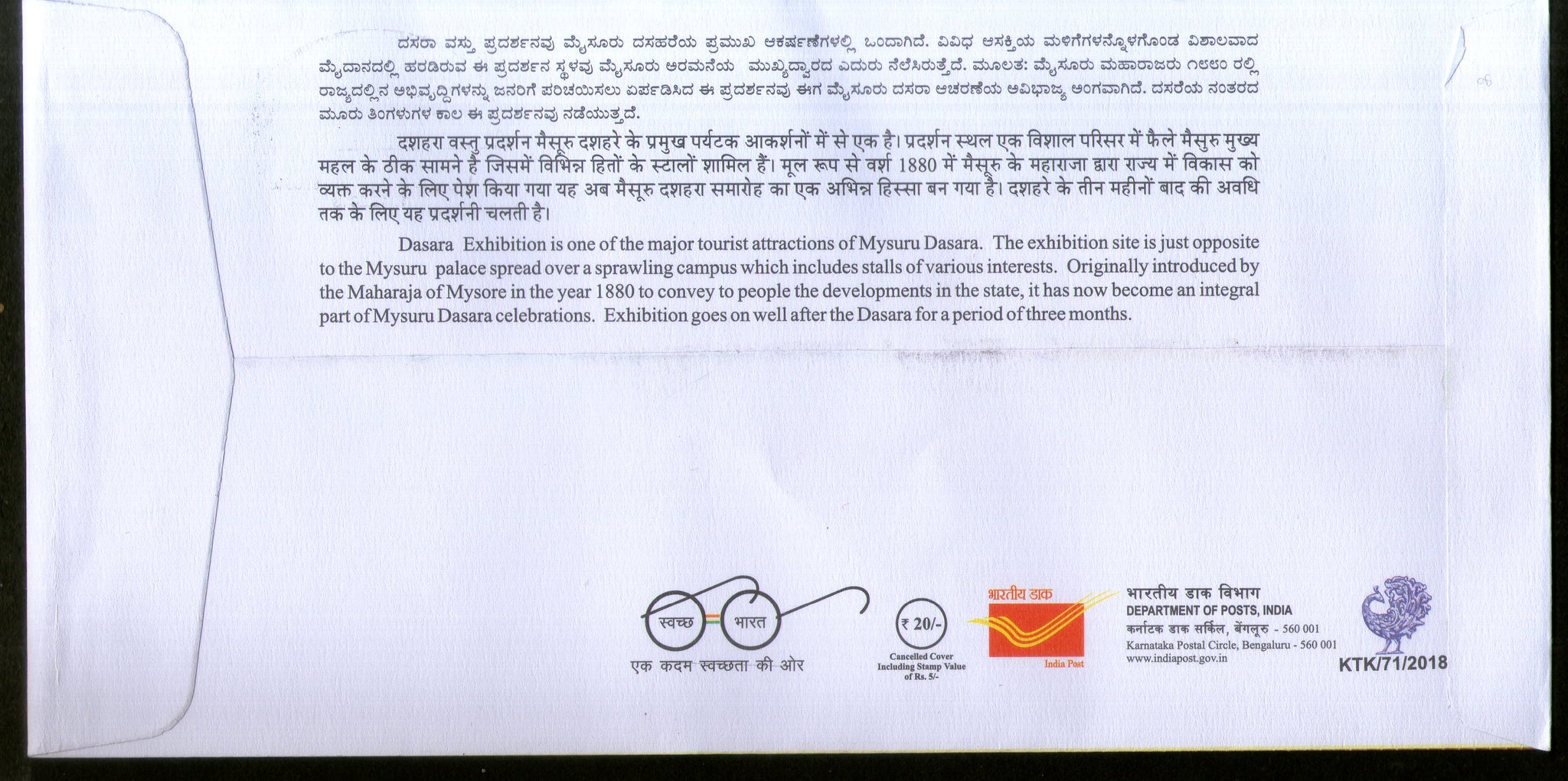 India 2018 Festival Mysuru Dasara Tourist Attractions Culture Special Cover # 18580