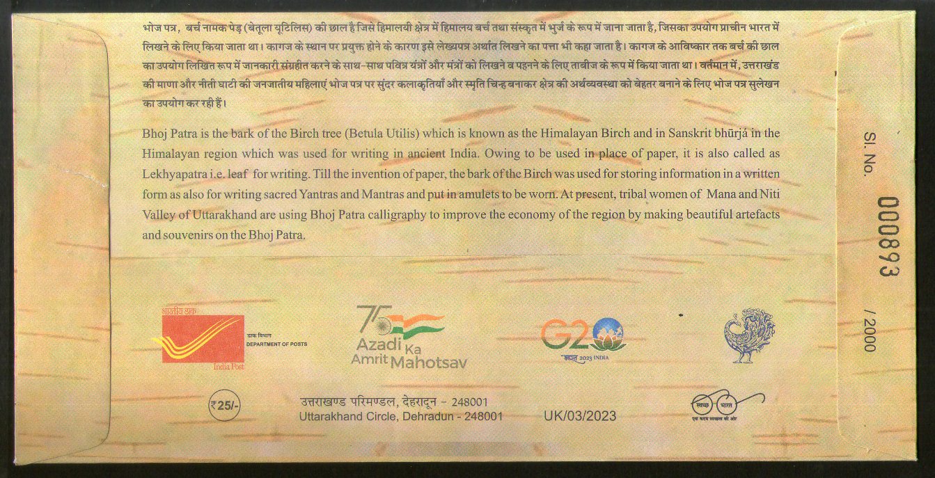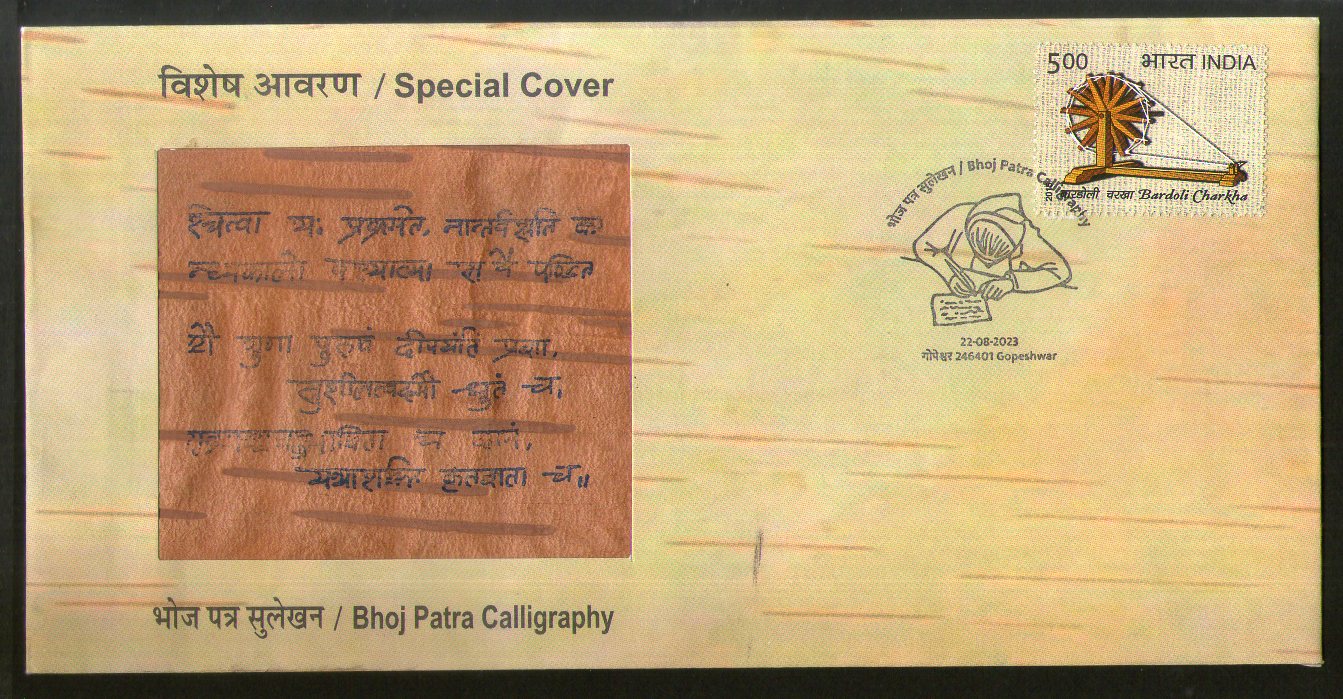 India 2023 Bhoj Patra Calligraphy Religion Special Cover with Real Birch Bark # 6541