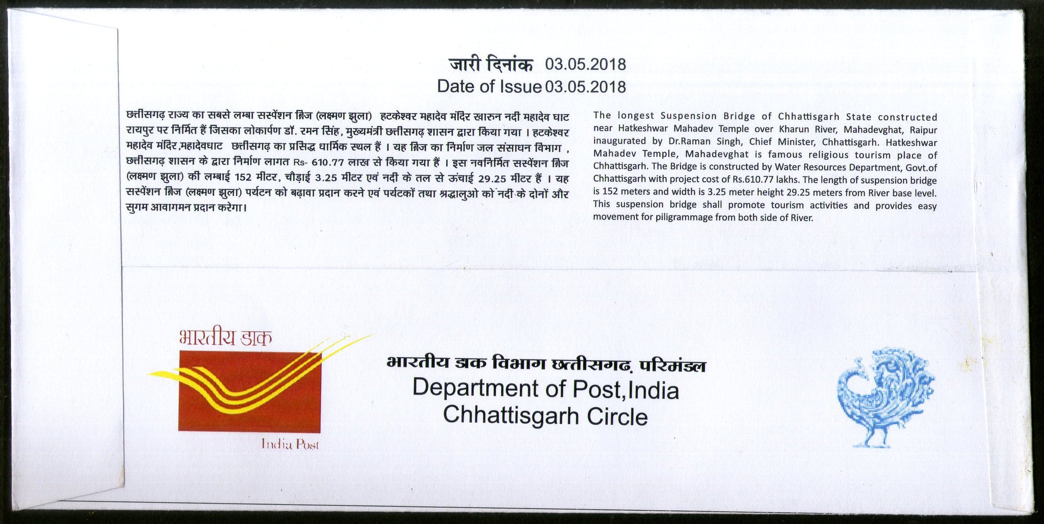 India 2018 Suspension Bridge Raipur Architecture River Special Cover # 18511
