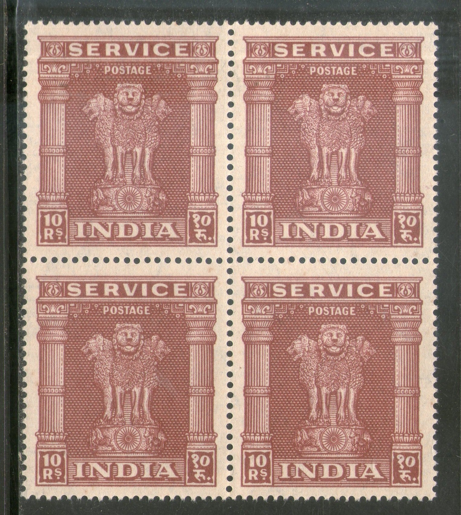 India 1950-51 Lion Capital 10 Rs Service WMK STAR Phila-S179 Blk/4 MNH - Phil India Stamps SALE