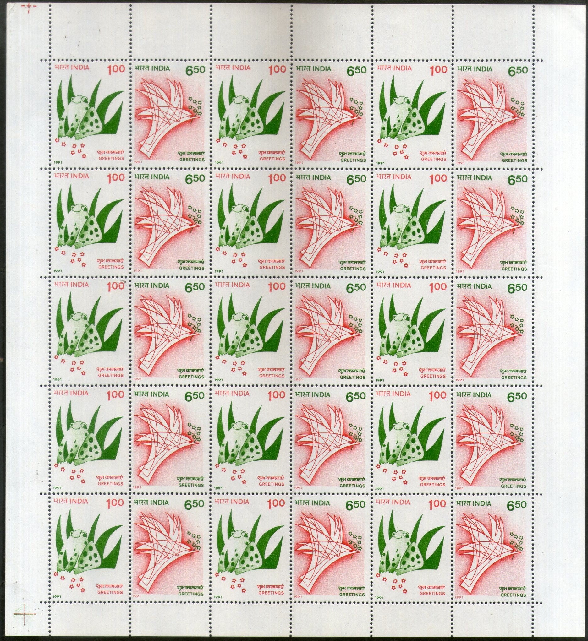 India 1991 Greetings Phila 1301 Se-tenant Full Sheet of 30 Stamps MNH # 167