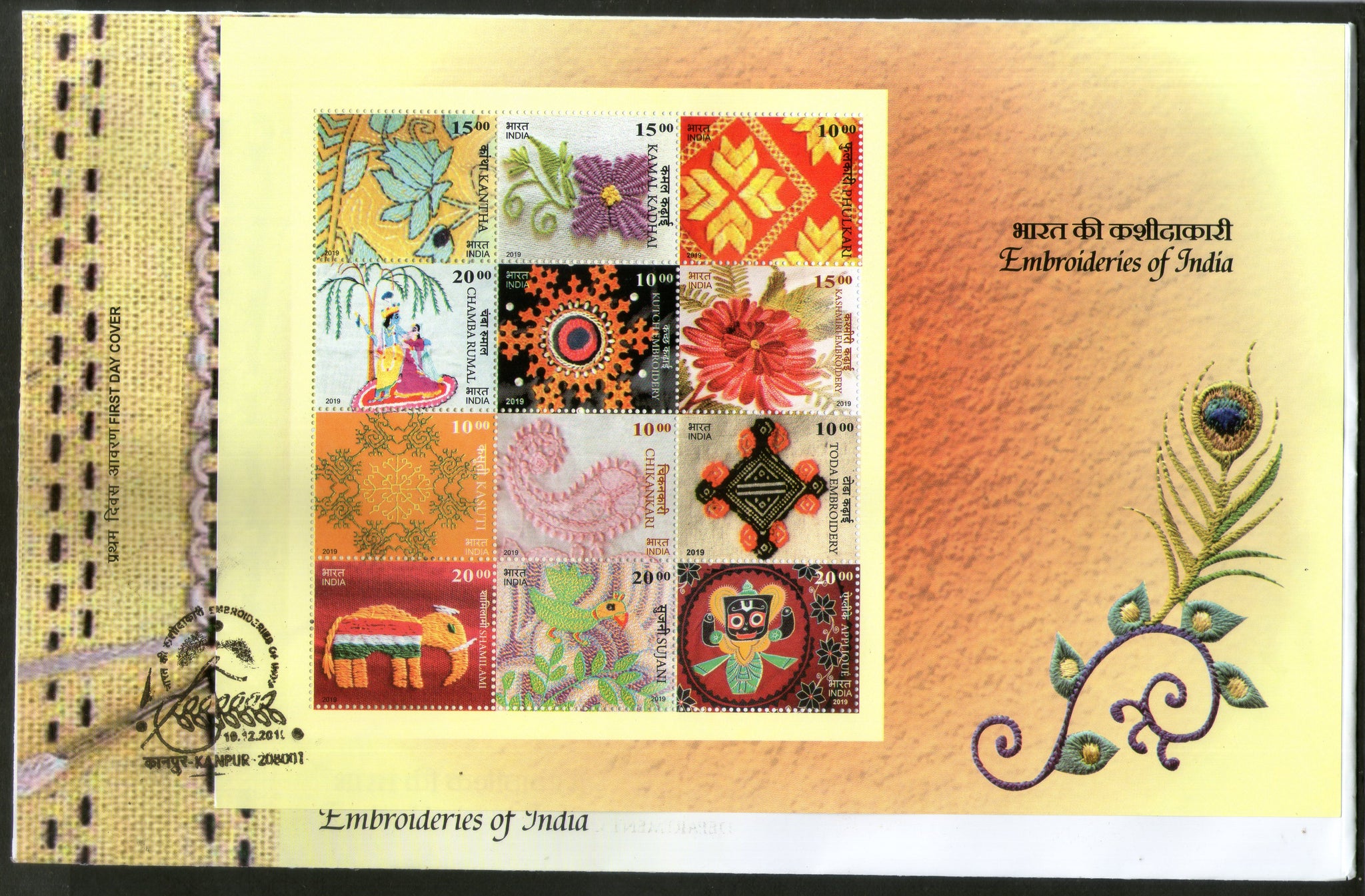 India 2019 Embroidery Textile Flowers Lord Krishna Radha Religion Parrot Elephant Art M/s on FDC