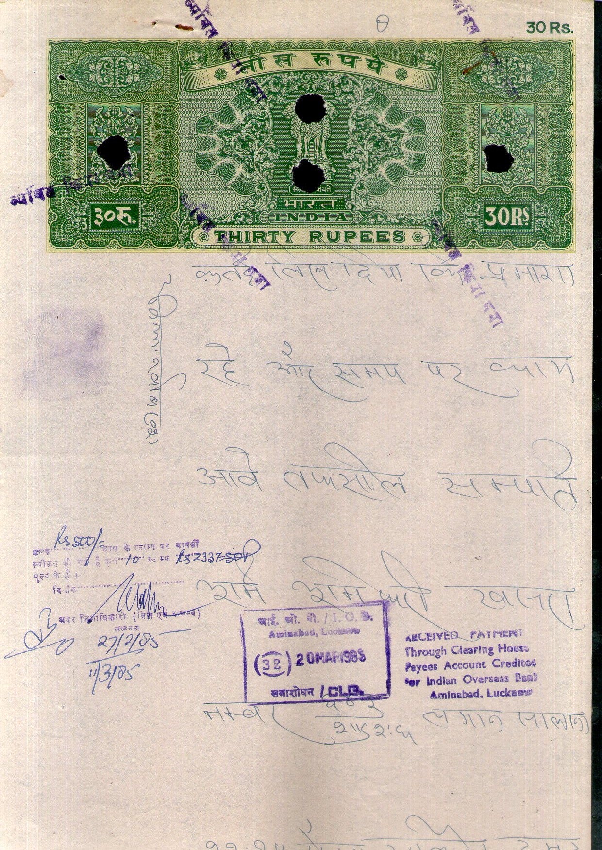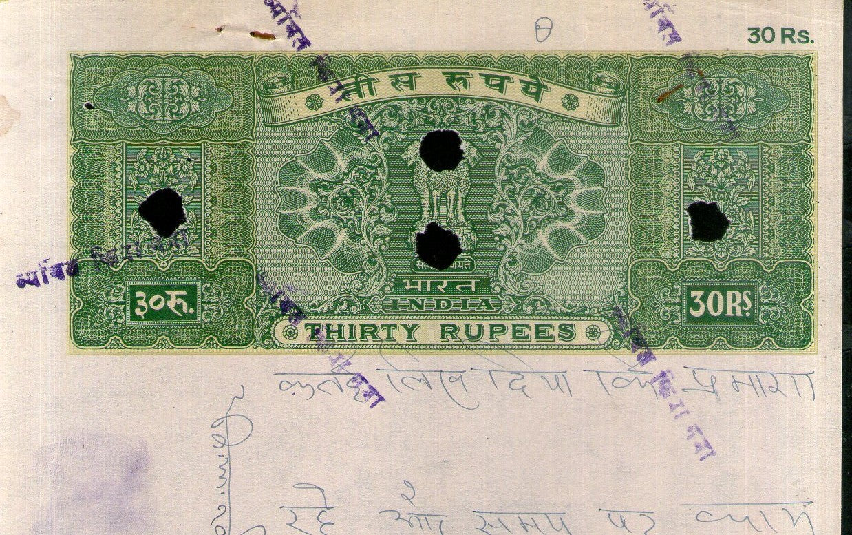 India Fiscal Rs. 30 Ashokan Stamp Paper Court Fee Revenue WMK-17 Good Used # 106