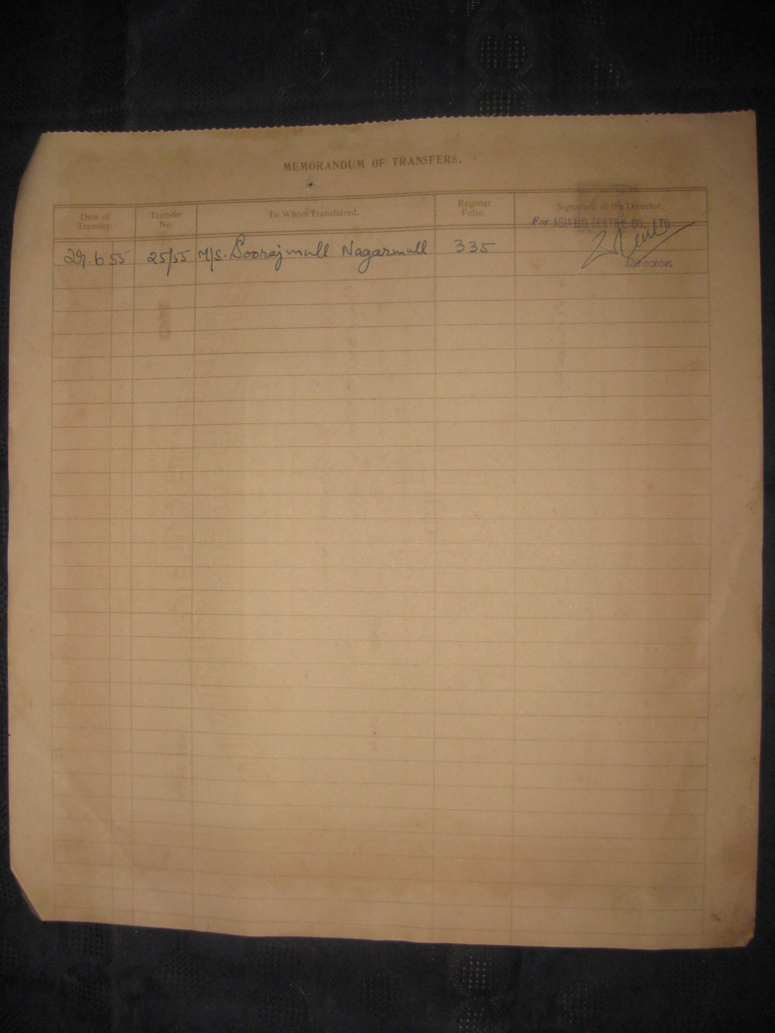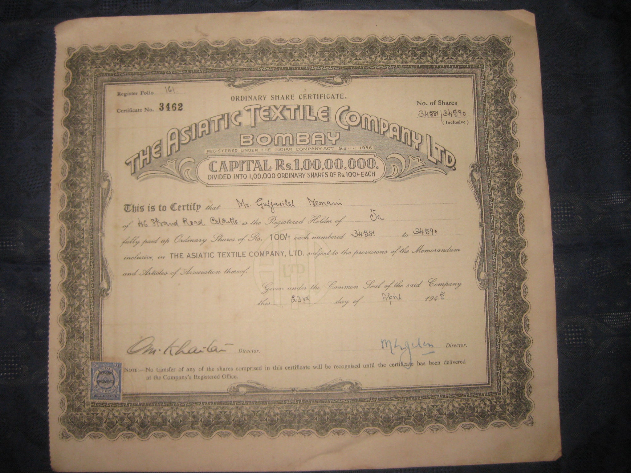 India 1940's The Asiatic Textile Co. Limited Bombay Share Certificate # FB04