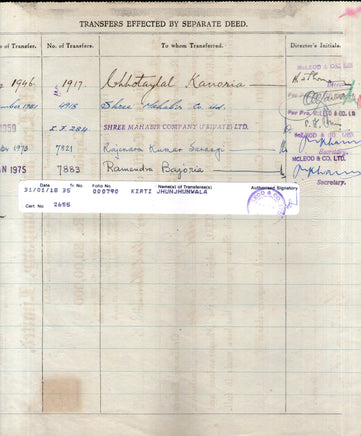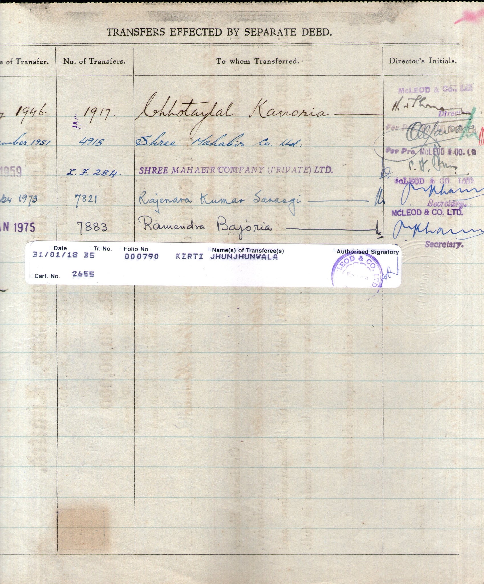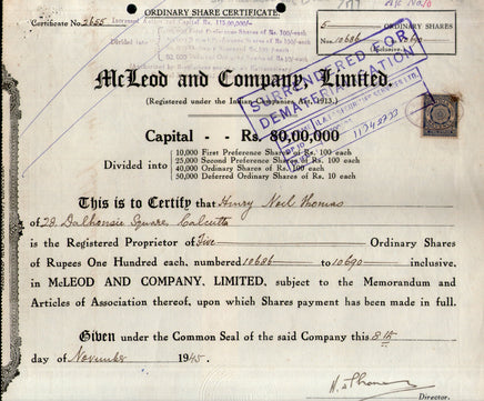 India 1945's McLeod & Company Ltd. Share Certificate + Revenue Stamp # FB15