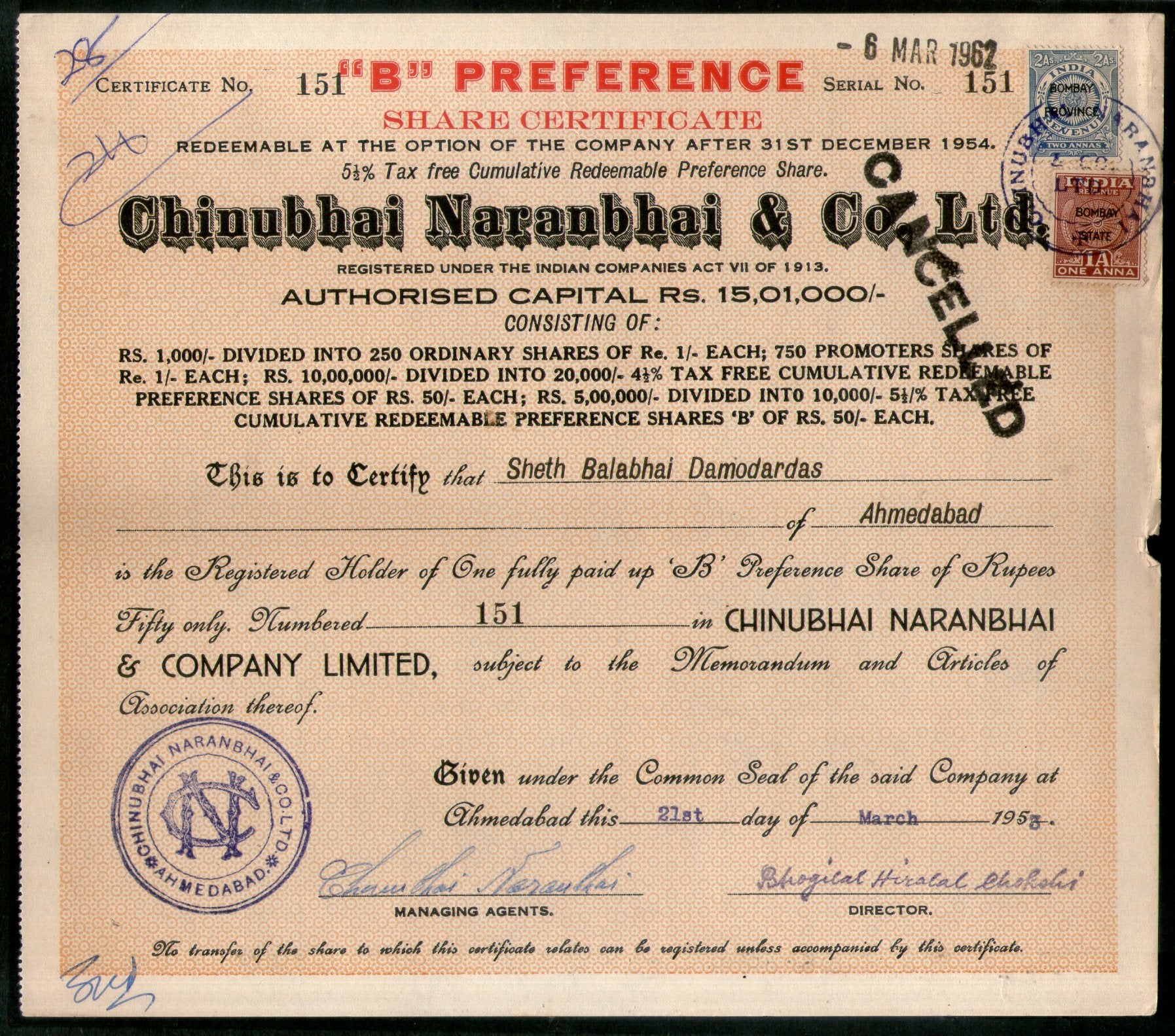 India 1950's Chinubhai Naranbhai & co. Share Certificate with Revenue Stamp # FA-19 - Phil India Stamps SALE