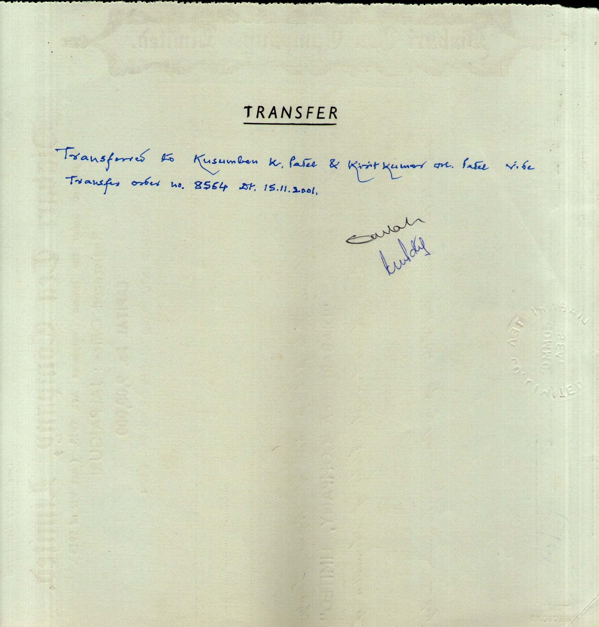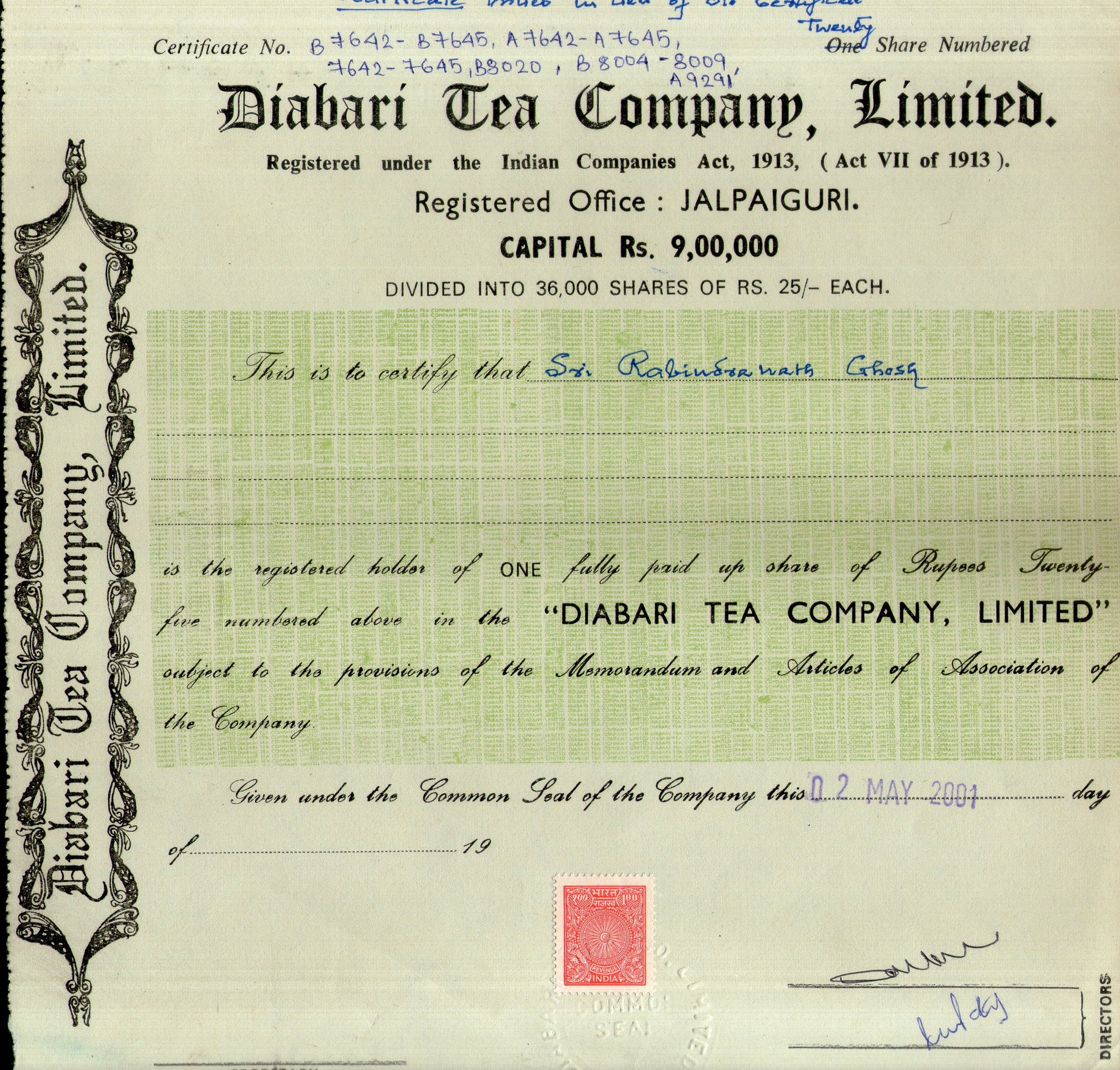 India 2001's Diabari Tea Company Ltd. Share Certificate + Revenue Stamp # FB14
